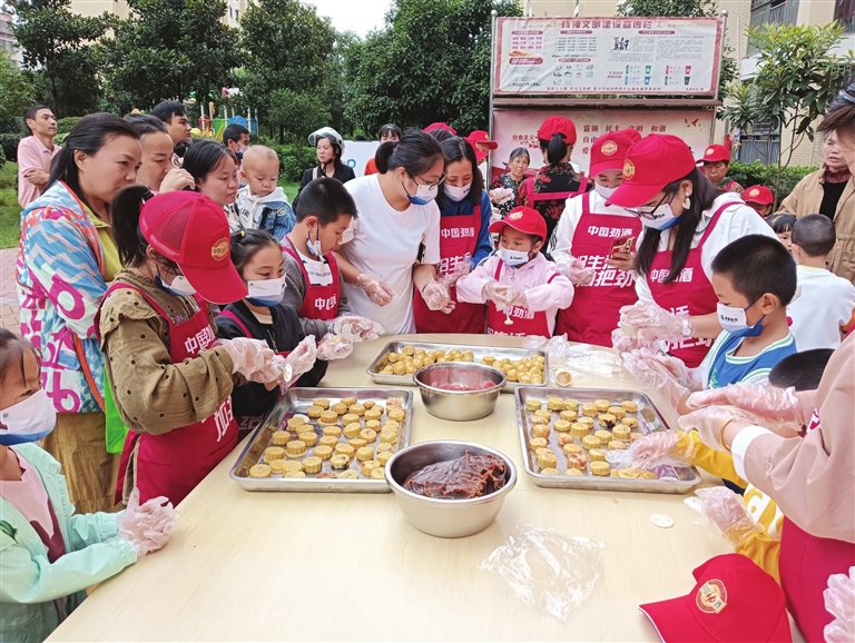 9月23日,红树湾小区举办“巧手迎中秋 欢聚迎国庆”活动。活动现场,小区物业公司和业主们制作月饼,喜迎中秋节。摄影 记者 胡圣