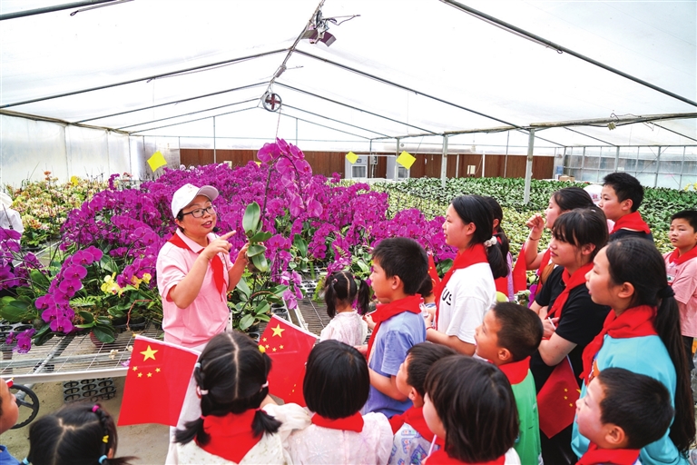 “你们知道这花为什么叫蝴蝶兰吗?”“因为它的形状很像蝴蝶。”5月31日,九合兰园蝴蝶兰绿植大棚,一群“花妈妈”正在为孩子们讲解蝴蝶兰花知识,现场欢笑声阵阵,传递着幸福与温暖。